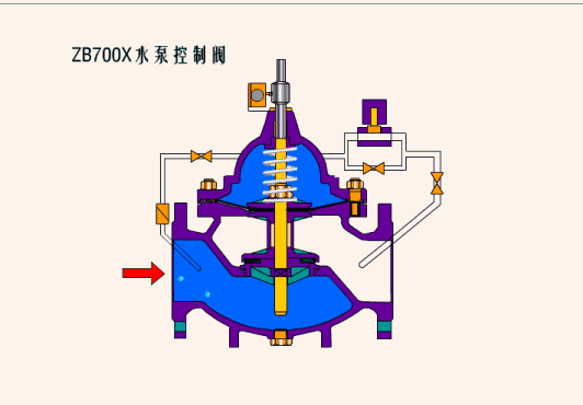 七、700X水泵控制阀当水泵工作阀门向下游供水时,电磁导阀全开,针阀调到适当开度,上游水经过针阀,导阀,单向阀进入主阀控制室,经电磁导阀流出,此时主阀控制室压力保持主阀处于合适开度,保持下游正常供水。700X水泵控制阀当水泵停止工作时,电磁导阀先关闭,主阀停止排水,主阀室压力升高,主阀开始关闭,当关闭90%时,主阀上部行程开关输出停泵信号,水泵停止运转,此时,主阀下游水经过单向阀进入主控制室,控制室压力升高,主阀关闭。