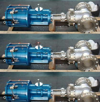 4、气缸盖上部装有气动-手动转换装置。将转换手柄顺时针方向提转到“气动”定位孔定位,闸阀处于气动操作状态;反之,将转换手柄逆时针方向提转到“手动”定于孔处定位,闸阀即可进行手动操作。带锥齿轮的手柄转换方向相反。 手动操作闸阀时,手轮旋向和普通手动阀一样,即顺时针转为关,逆时针转为开。带锥齿轮转动的相反。