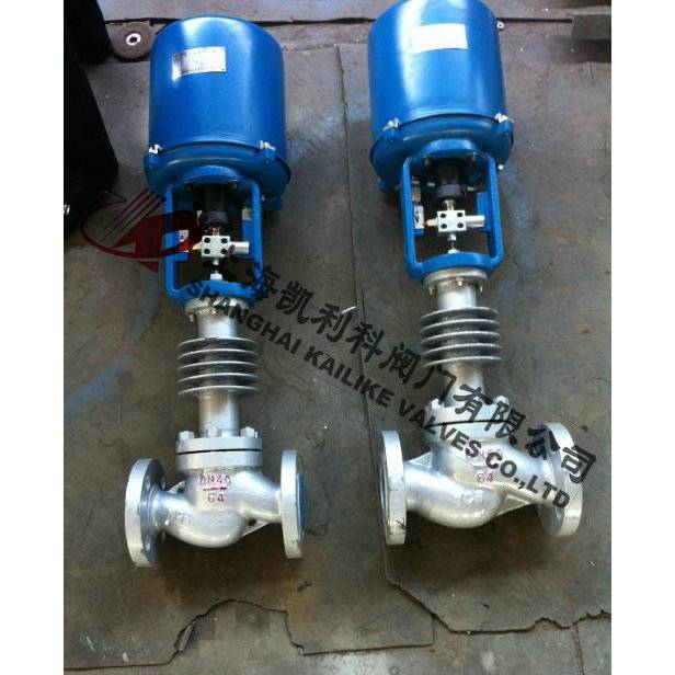由单座调节阀、电动执行机构、温度传感器和温度调节器等部件组成,根据用户需要,分别有加热型与冷却型两种结构。加热型调节阀的结构与原理,工作前主阀芯处于半开位置,传感器处于自然状态。接上电源,主阀芯全开。介质由箭头方向流入主阀体、经阀芯对储热箱进行加热。当温度升到相应设定值时,传感器即产生相应线性信号输入一体化执行机构,随即驱动阀杆、阀芯产生位移,关闭主阀芯停止加热。当温度低于设定值时,传感器即产生线性信号输入一体化执行机构,驱使阀芯渐开,使介质按抛物线特性流入储热箱,进行加热直至设定值。这样被控介质始终在设定温度范围内被控制,从而达到控温目的。