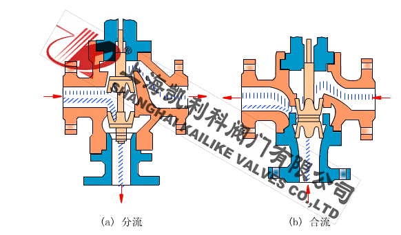 三通调节阀阀芯结构为圆筒型薄壁窗口形阀芯,采用阀芯侧面导向与阀座内表面导向和上衬套导向,因此导向面积大,工作可靠。流体对阀芯作用方向都处于流开状态,故阀工作性能稳定。三通调节阀有三通合流式调节阀(把两种流体经三通阀混合成一种流体)和三通分流式调节阀(把一种流体经三通阀分成两路流出)两种形式。当公称通径DN≤80mm和压差较小的场合时,分流阀可以采用同口径的合流阀代替。流量特性有直线性、抛物线性两种。三通调节阀它可以代替二台同时使用的二通调节阀,起分流或合流作用及两相调节配比作用。