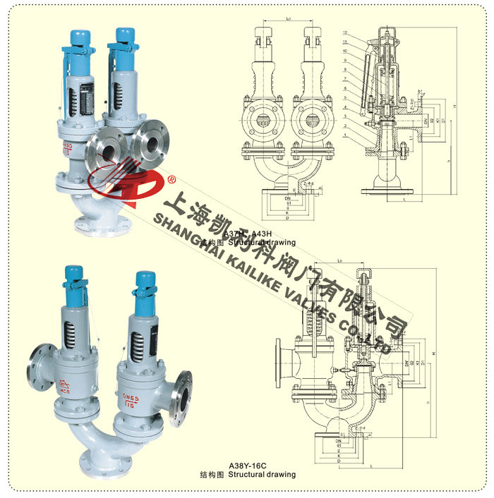 A38Y、A43H、A37H双联式安全阀适用于工作温度≤350℃的蒸汽、水等介质的设备和管路上。作为超压保护装置。A38Y、A43H、A37H型双联式安全阀是在Y型接头上装设两个同样规格的A48Y或A47H型安全阀而构成,其公称通径系列指Y型接头进口通径。